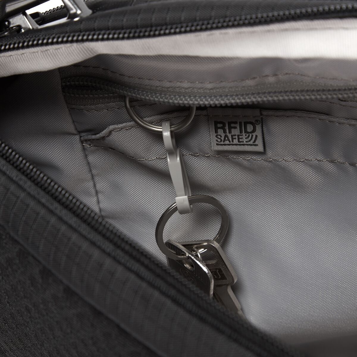 - eXomesh® slashguard and Roobar™ locking system protect valuables from theft