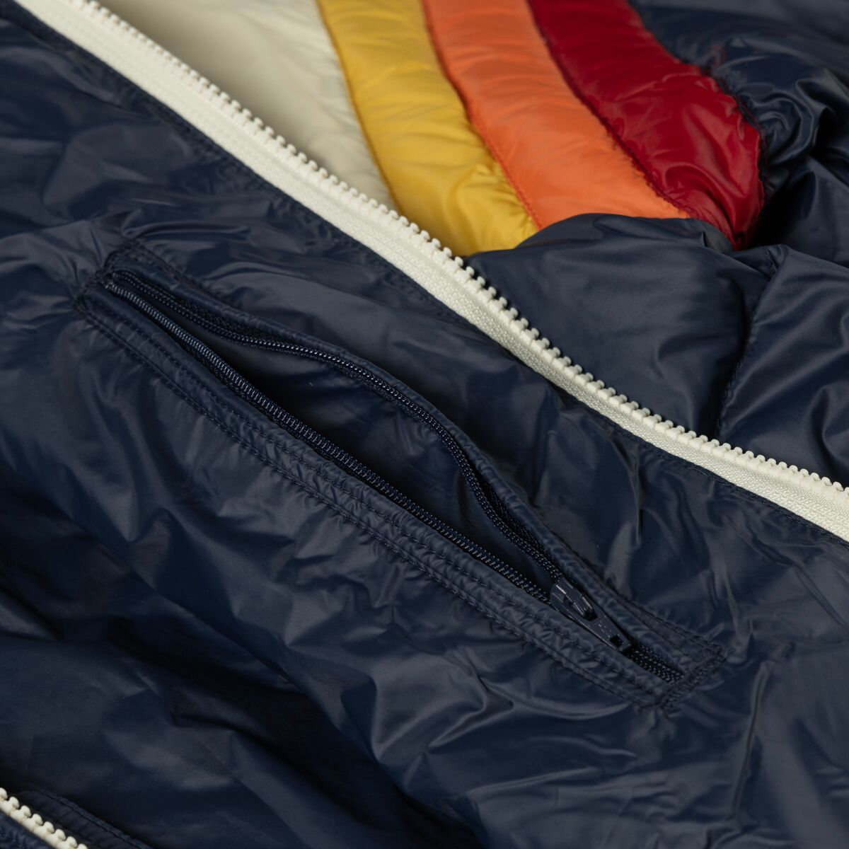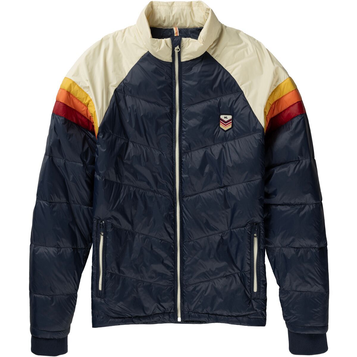 The Marine Layer Archive Puffer Mock Jacket is a down insulated midlayer that we trust under a shell or as a stand alone piece. The lack of a hood makes this jacket easy to layer, while the down insulation traps heat without the weight, and the nylon face fabric handles abrasion when it is our outer layer.