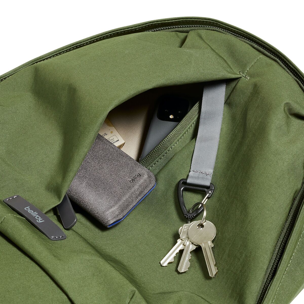 - [external] 1 zippered front with key clip, 1 soft-lined zippered top [internal] 1 zippered