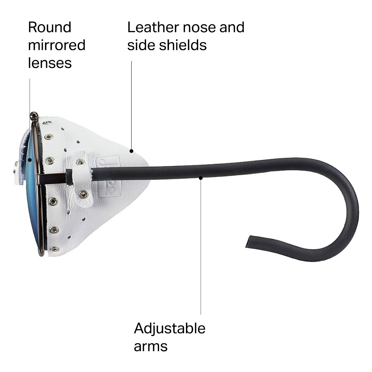 • Leather nose pieces and side shields block reflecting light