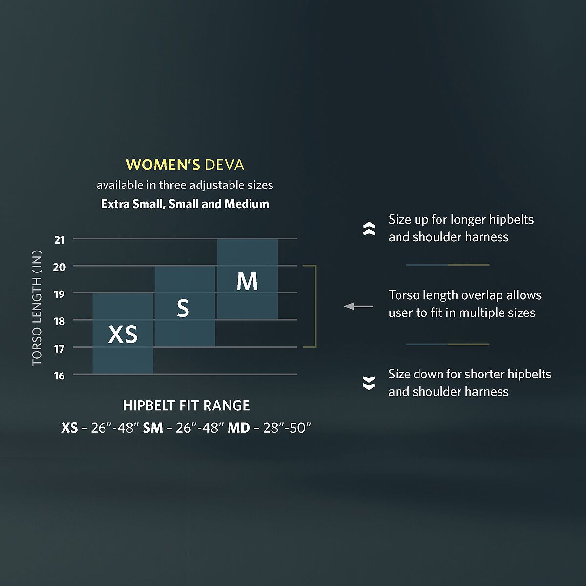 - [x-small] 66L (4027cu in), [small] 70L (4272cu in), [medium] 74L (4516cu in)