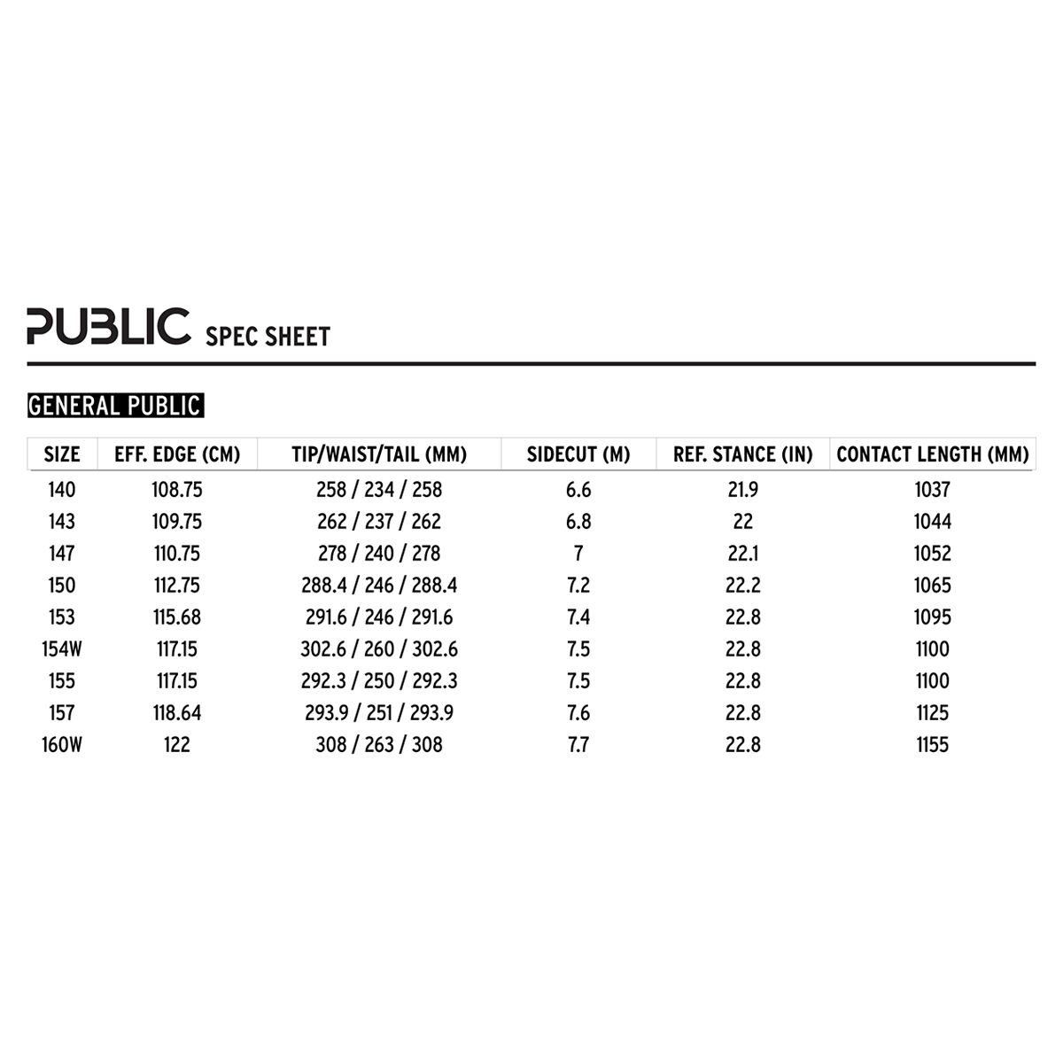 - [140cm] 234mm, [143cm] 237mm, [147cm] 240mm, [150cm] 246mm, [153cm] 248mm, [154cm wide] 260mm, [155cm] 250mm, [157cm] 251mm, [160cm wide] 263mm