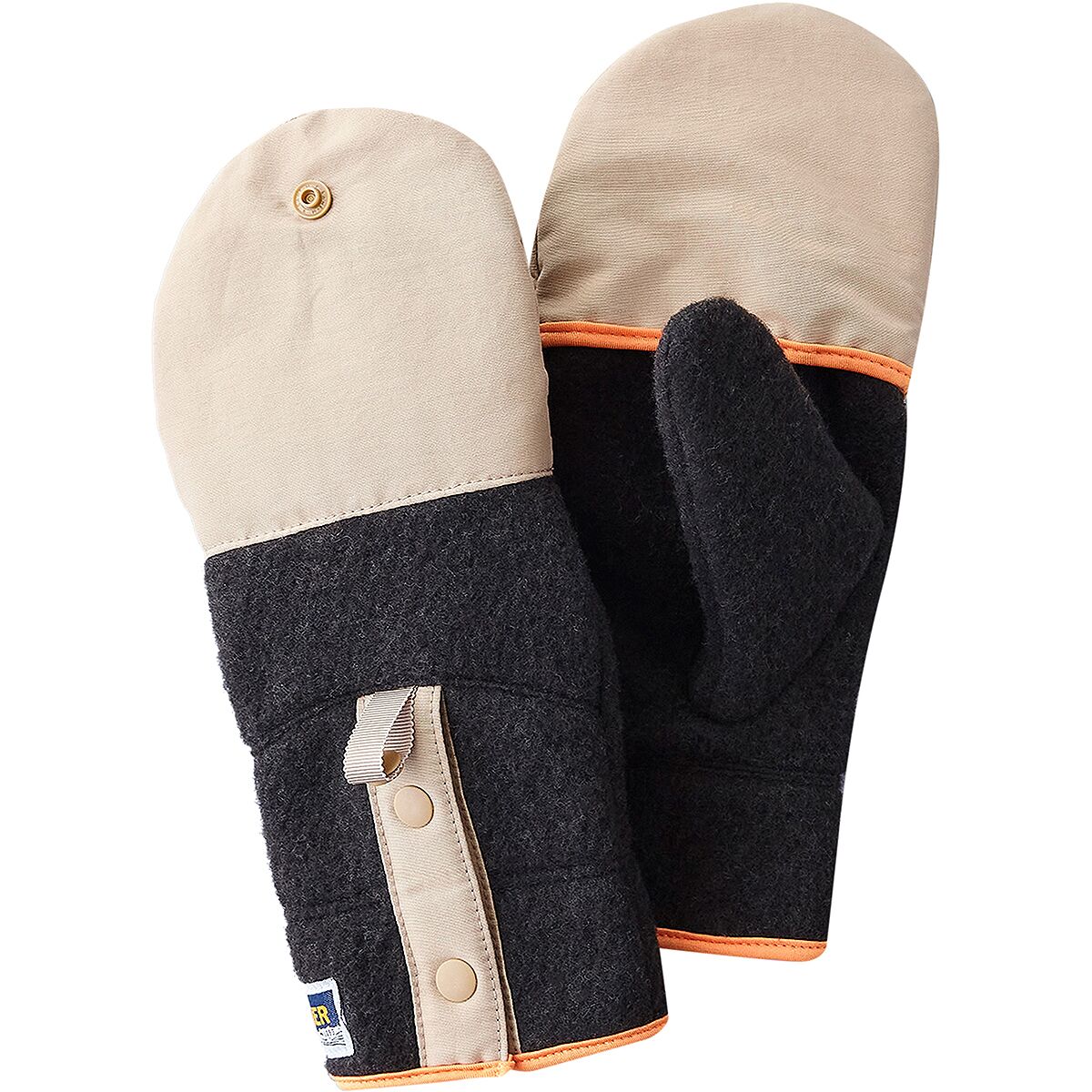 Flip mitten, Recycled wool fleece body, slit-open cuff, touch panel compatible.