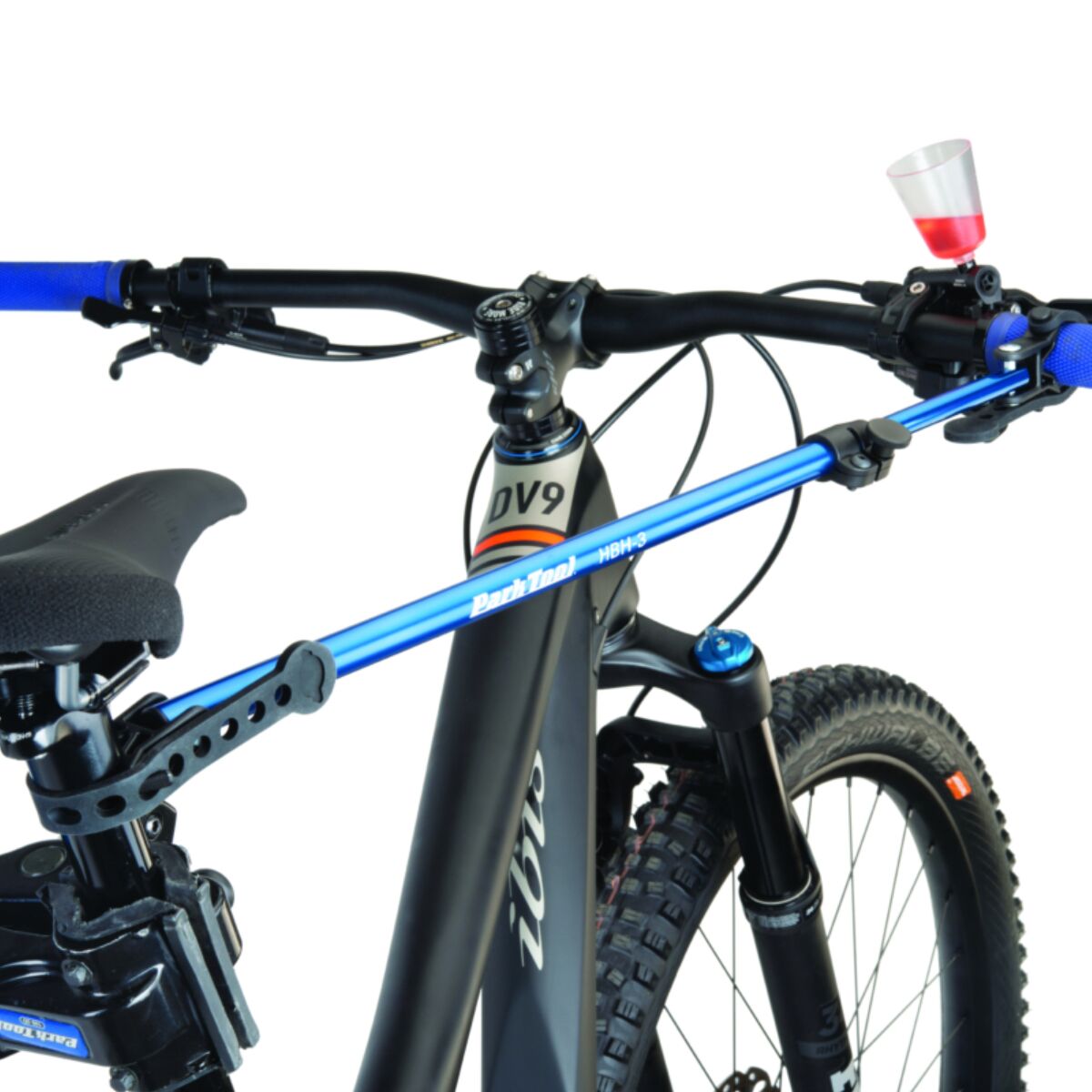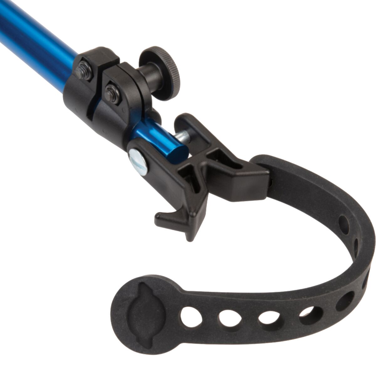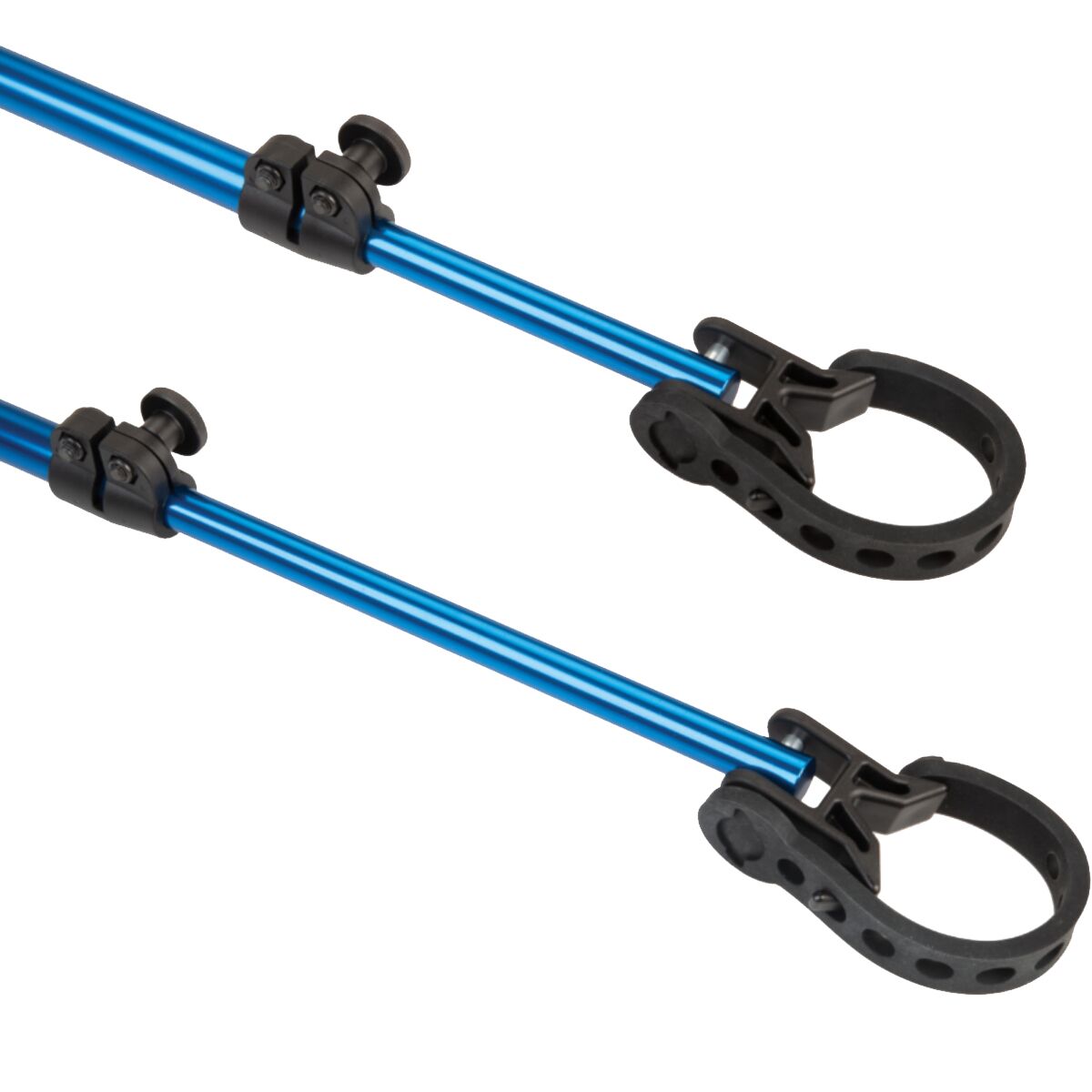 The HBH-3 securely holds handlebars in place on any bike in any position while in a repair stand. Useful for brake bleeding, cable and housing routing, bar tape wrapping, or any scenario where you want to prevent the handlebars from rotating, including storage or working with the bike rotated upwards. With rotating articulating clamps and 14 inches of adjustability, the HBH-3 can easily be attached in a wide variety of configurations onto almost any handlebar, seatpost, frame, fork, or even the repair stand itself. The soft rubber straps adjust to fit virtually any tube found on a bicycle, including irregular and aero-shaped tubing. Anodized aluminum construction.