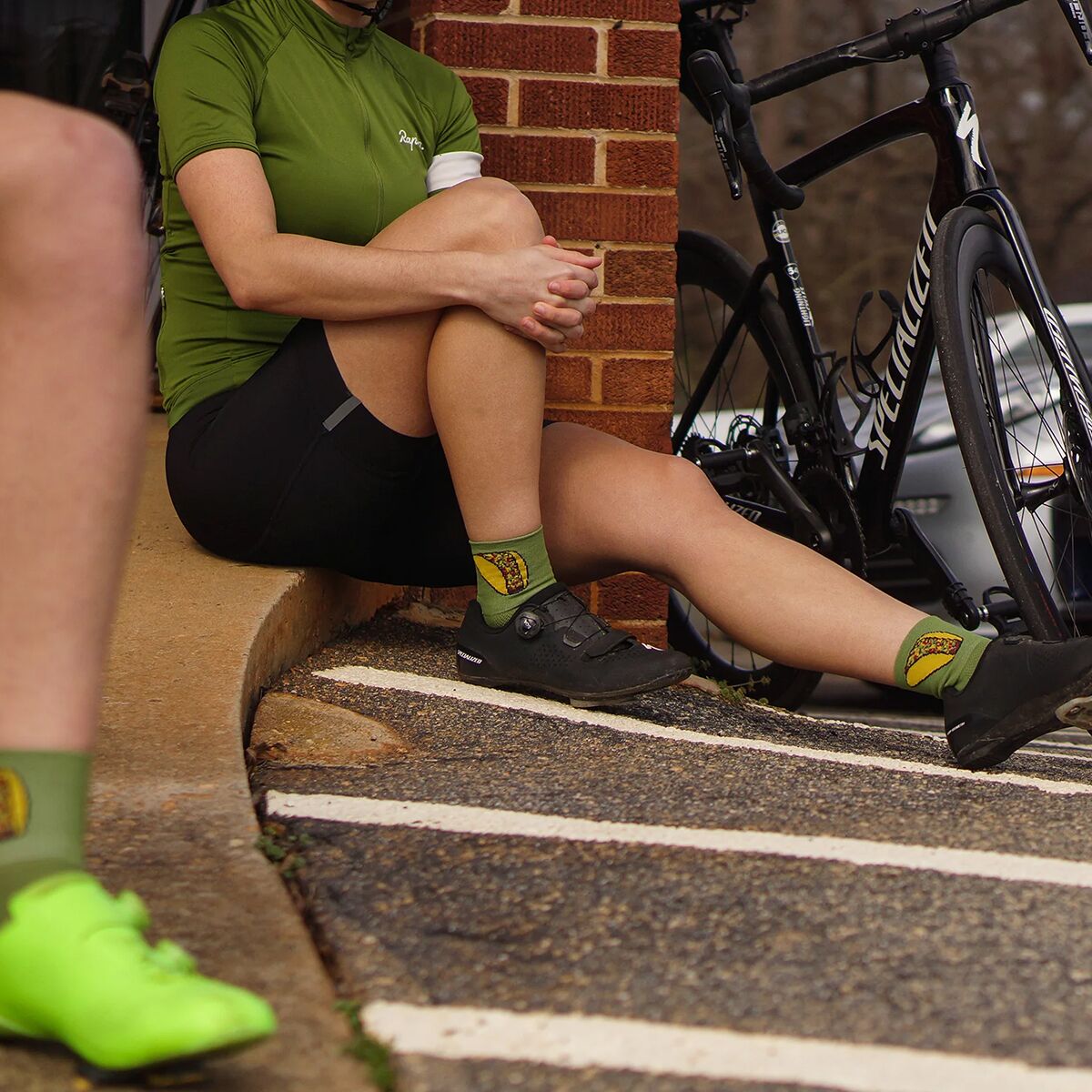 Aireator 3" quarter cuff Taco sock is an avocado green cycling sock with a loaded taco on either side of the 3" double cuff.
