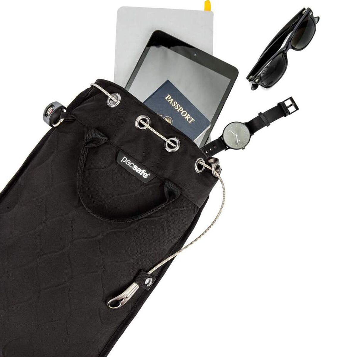 his portable, 5L safe packs 360 wire eXomesh technology and a stainless steel locking cable to anchor your things to any immovable object, keeping your tablet, phone, passport and more protected, while youre out embracing lifes adventures.